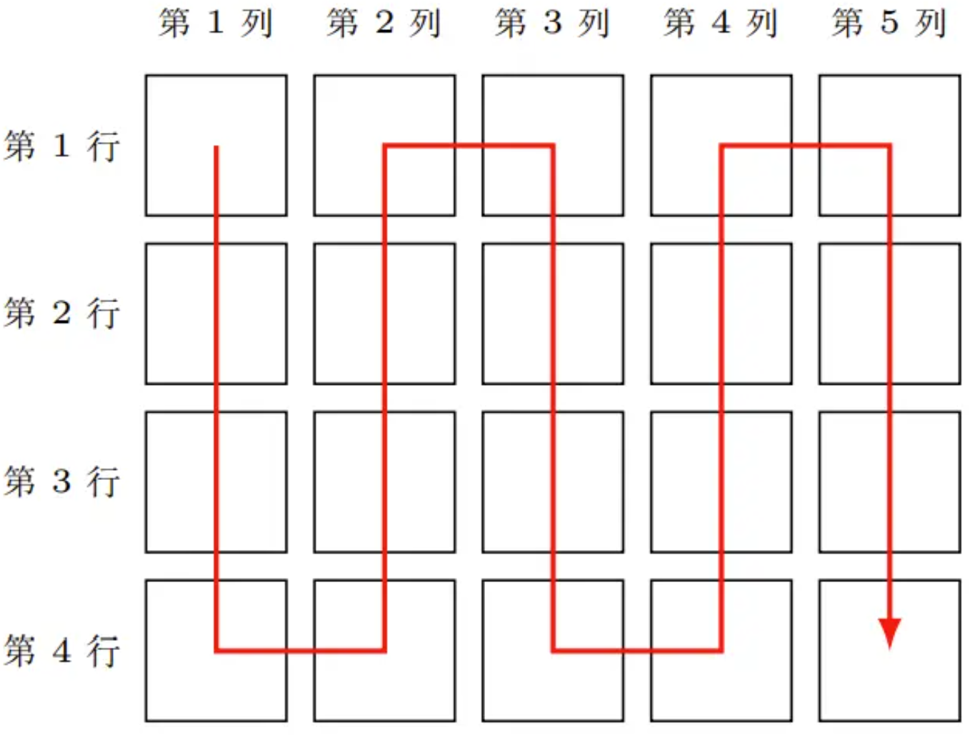 例如,若 $n = 4, m = 5$,则所有 $4 \times 5 = 20$ 名考生将按照 CSP-J 2025 第一轮成绩从高到低的顺序,根据下图中的箭头顺序分配座位。