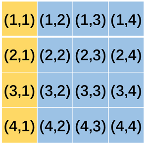 图中标注为黄色的四个格子是黄金格,坐标分别为 $(1, 1)$,$(2, 1)$,$(3, 1)$,$(4, 1)$。