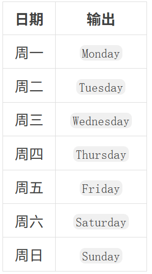 输出一行一个字符串,表示答案。对于一周中每天的对应输出如下: